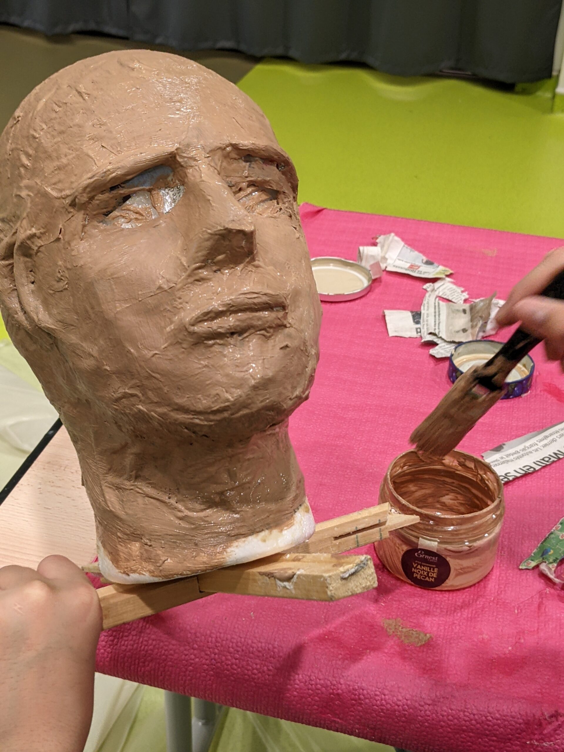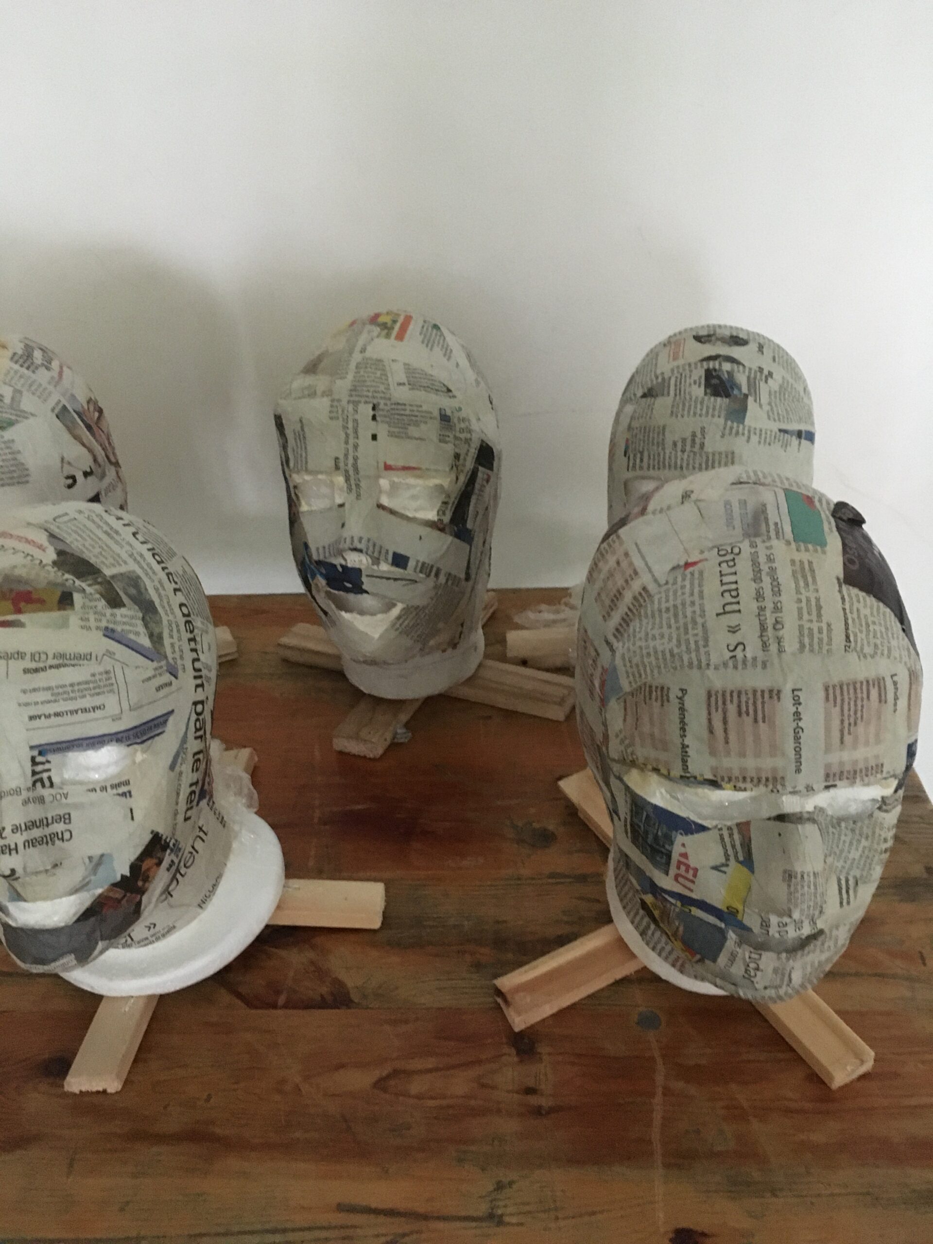 Après le moulage des visages, place au papier mâché ! Cette technique permet d’apporter de la solidité au masque mais surtout de définir les traits du visage du personnage.