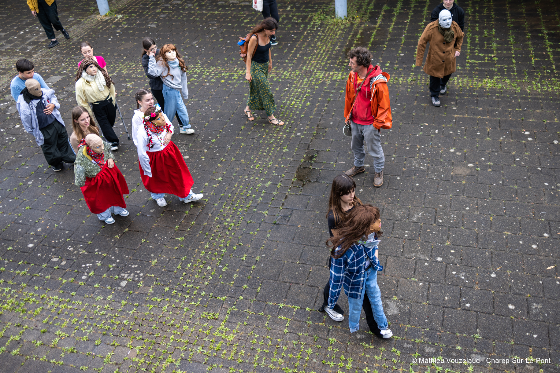 Cette année, avec Julie Fache (Compagnie J’AI VU LOUISA), les élèves travaillent sur le corps silencieux et la présence dans l’espace public avec la marionnette à corps porté.