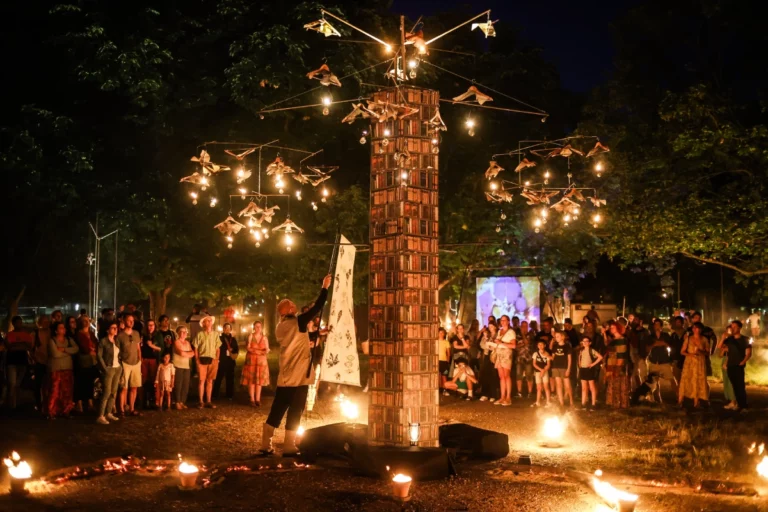 Expérience onirique, immersive et sensible, D’Arbre en Arbre nous embarque dans un voyage cinématographique et musical à la lueur de la flamme, entre peinture, projection vidéo, machinerie rêveuse et drolatique.