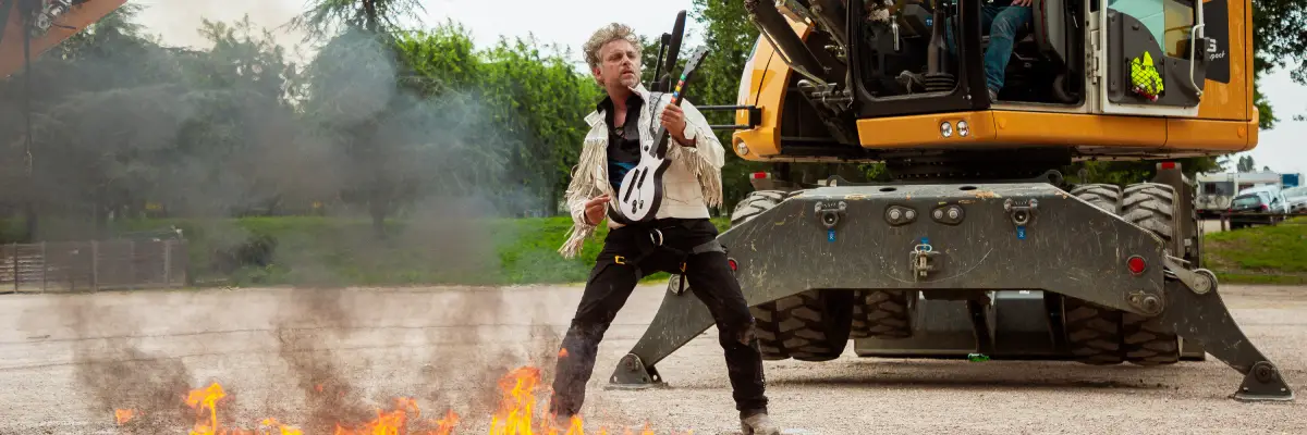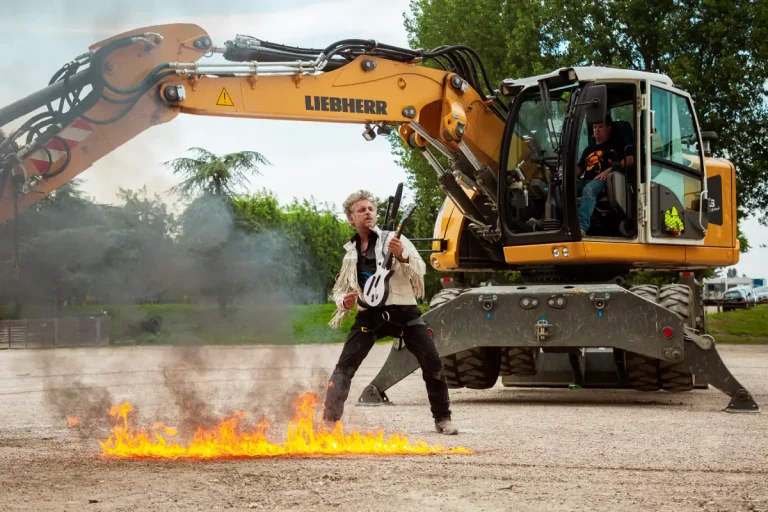 Création sur Johnny Halliday avec une pelleteuse de 22 tonnes (parce qu'avec un hélico, c'est surfait et qu'une Harley, c'est trop cher)